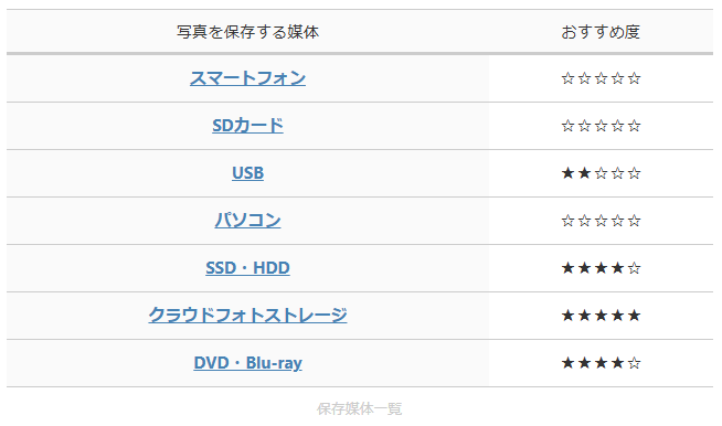 主な保存方法は次のようなもので、このうち「USB」「SSD・HDD」「クラウドフォトストレージ」について記載します。